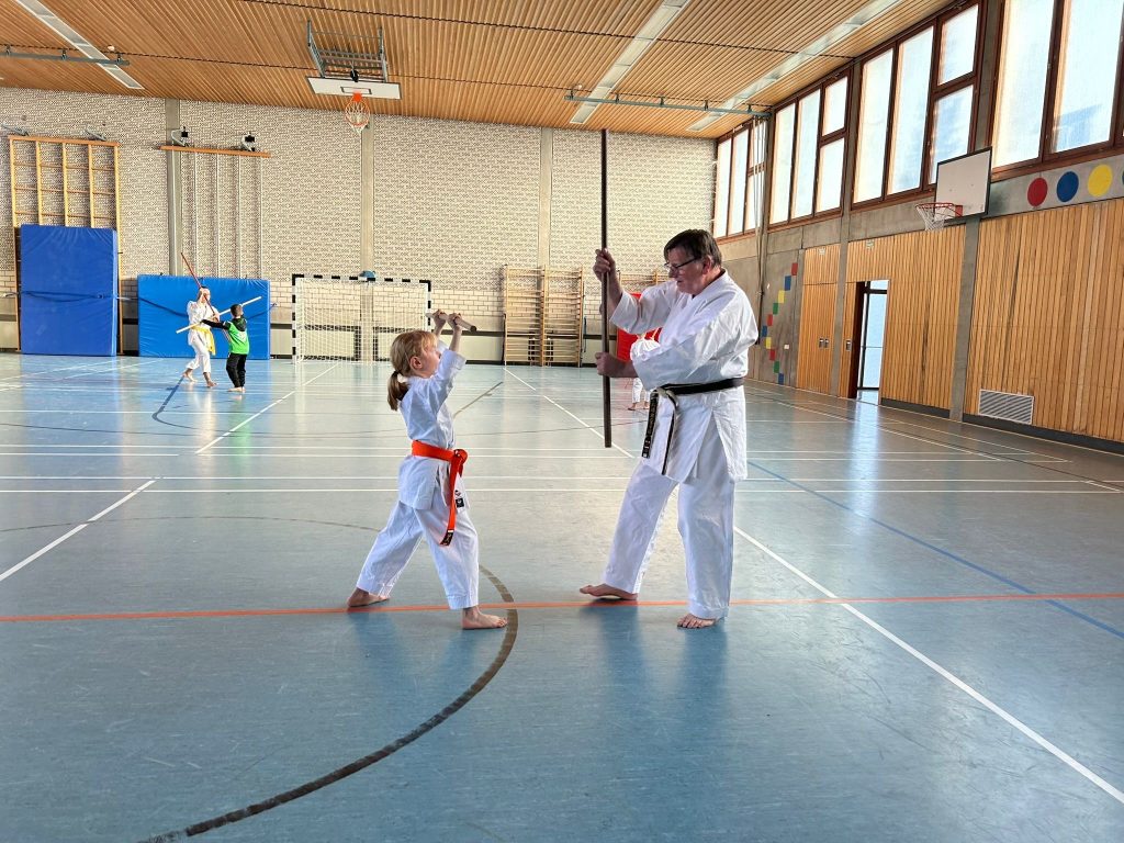 Im Anschluss folgte eine Einführung in den Umgang mit dem Bo, einer traditionellen japanischen Stabwaffe. Unter fachkundiger Anleitung wurden erste Grundtechniken vermittelt und einfache Übungen gemeinsam ausprobiert. Für viele Teilnehmende stellte dieser Programmpunkt eine spannende neue Erfahrung dar.