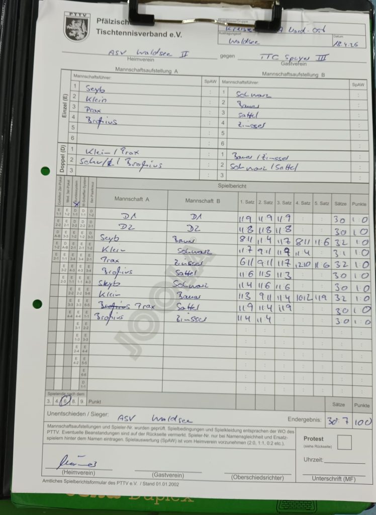 Zwar stellt ein Verlustspielfreies 10:0 eine gewisse Eindeutigkeit dar, doch zeigte sich die 3. Mannschaft des TTC Speyer am Tisch kämpferisch und verlangte uns alles ab.